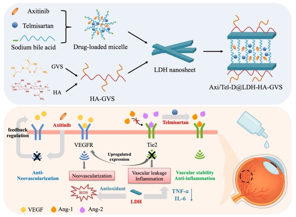 眼底新生血管性疾病(如湿性年龄相关性黄斑变性、糖尿病视网膜病变等)是全球不可逆视力损伤的主要原因,其核心病理特征为异常血管生成和血管渗漏。虽然抗VEGF玻璃体内注射已成为临床标准治疗手段,但该方式具有侵入性强、并发症风险高等局限,且部分患者对单一抗VEGF治疗反应存在耐药现象,提示多通路协同干预与无创给药策略的迫切需求。血管生成素-2(Ang-2)可通过破坏血管稳定性并协同VEGF信号,加剧病理性新生血管形成。基于此,本研究构建了一种基于层状双氢氧化物(LDH)的双药纳米递送系统,实现了VEGFR抑制剂阿西替尼(Axi)与Ang-2调控药物替米沙坦(Tel)的无创联合递送。针对两种药物水溶性差、难以直接插层进入LDH层间的难题,研究团队采用胶束辅助插层策略,实现了疏水小分子在LDH层间的有效插层与稳定负载。在此基础上,通过在LDH表面进一步修饰透明质酸(HA)-PepT1靶向三肽(GVS),赋予纳米载体良好的眼表黏附能力和组织渗透性能。
