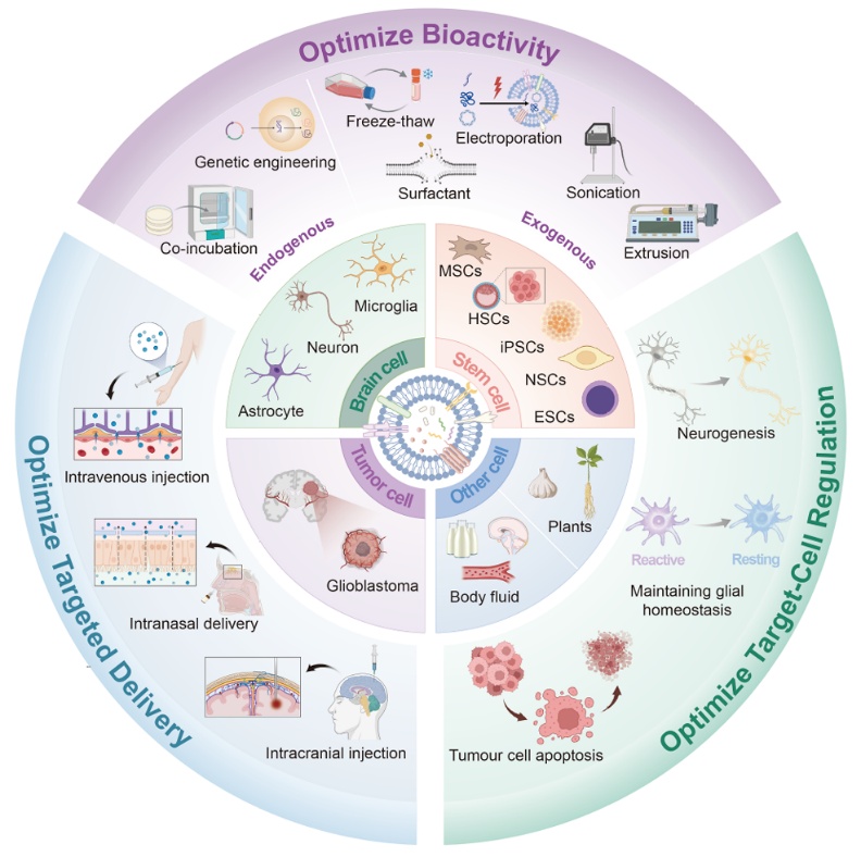 近年,团队聚焦仿生药物递送和靶向递药策略开发等领域发表系列成果(Nat Commun 2025;Sci Adv 2025;PNAS 2023;Adv Mater 2023),近期重点关注工程外泌体递药可行性设计,通过外泌体结构与功能集成调控、生物发生机制与功能特性研究,综述了外泌体用于增强治疗活性、优化脑内递送及提升细胞靶向精度的工程化策略。相关成果在Cell子刊Cell Biomaterials发表综述论文Engineered exosomes as precision tools for brain-targeted drug delivery and treatment of central nervous system diseases。文章从机制与转化双视角出发,解析了该领域面临的转化挑战和发展方向,为工程化外泌体从中枢神经系统疾病的基础研究向临床转化提供参考。药学院丁杨教授、张华清研究员为本文共同通讯作者,药学院博士后金熠、2024级硕士生张一帆和2022级博士生宋明杰为共同第一作者,中国药科大学为论文唯一通讯单位。