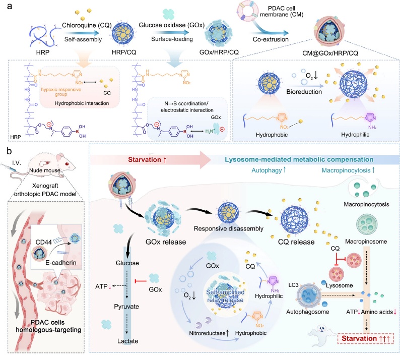 近日,我校药学院丁杨/张华清团队在权威期刊Advanced Materials发表研究型论文Self-Amplified Nanomedicine Enables Lysosomal Blockade to Potentiate Starvation Therapy of Pancreatic Ductal Adenocarcinoma。药学院丁杨教授、张华清研究员和工学院仲启凤副教授为本文共同通讯作者,中国药科大学2022级博士生宋明杰、2025级博士生张紫茹、皖南医学院弋矶山医院潘璇主治医师和中国药科大学2020级硕士生杨筱钰为共同第一作者,中国药科大学为论文第一通讯单位。