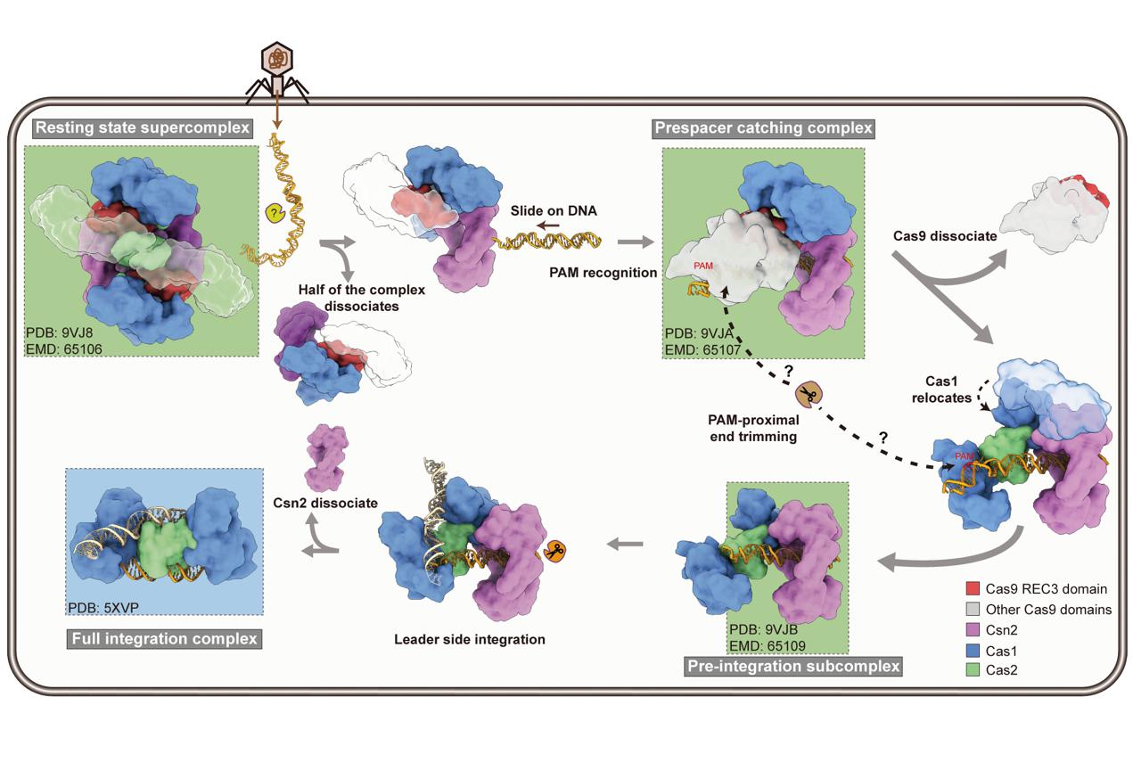 针对这一关键问题,研究团队解析了Cas9、Csn2与Cas1-Cas2组成的四蛋白复合体结构,并发现Cas9在适应阶段发挥“侦察—筛查”的关键作用。Cas9可沿DNA进行PAM扫描并筛选候选片段,而Csn2则通过捕获DNA末端并对DNA长度进行定标,使候选片段形成约30 bp的标准前间隔序列。随后Cas9解离触发复合体结构重排,使Cas1-Cas2整合酶接管并完成DNA整合。该研究揭示了II-A型CRISPR系统中Cas9如何指导Cas1-Cas2整合酶识别PAM、筛选DNA与前间隔序列整合之间的协同机制,极大加深了对Cas9参与CRISPR免疫记忆形成机制的理解。