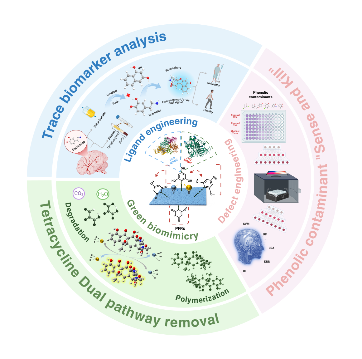 具有纳米酶活性的二维(2D)金属有机框架纳米片(MONs)具有广泛的应用前景,然而其规模化和环保合成仍面临挑战。本研究利用过期的间苯三酚药物与Cu2+在室温水溶液中通过一步法快速配位自组装合成了生物启发型Cu-MON,实现了过期药品废弃物的高值回收利用。该Cu-MON表现出优异的漆酶样和过氧化物酶样活性,在催化效率、动力学性能和稳定性方面显著优于天然酶及其他铜基纳米酶。其卓越性能源于超薄介孔结构、高铜含量和工程缺陷,从而增强了对底物的吸附和活化能力。密度泛函理论计算揭示了配体调控在降低反应能垒和促进电子转移中的关键作用。值得注意的是,本研究阐明了金属-配体-底物的协同效应,不仅涉及Cu2+-Cu+氧化还原循环,还包括配体中具有氧化还原活性的官能团与金属位点/底物之间的同步配位和电子转移。基于其漆酶样活性及对不同酚类污染物的差异化响应,本研究构建了机器学习赋能、智能手机集成的比色传感阵列,用于现场快速区分结构相似的酚类污染物。与传统的“仅检测”平台不同,该系统集成了“检测与去除”的双重功能,可高效去除污染物。此外,本研究还发现了一种针对四环素类抗生素的新型降解-聚合双途径去除机制,可实现近完全去除和脱毒。最后,基于过氧化物酶活性,本研究构建了双模式比率荧光-比色传感器,用于生物体液中多巴胺的检测,并通过交叉验证确保结果的高可靠性和准确性。这种“一材三用”策略为设计用于污染物监测、环境修复与生物传感的新一代多功能纳米酶提供了新视角。