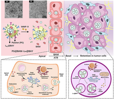 为突破ATR瓶颈,本研究构建了四种在肿瘤外基质(ECM)密度,血管分布和EPR效应具有高度异质性的动物模型,并筛选了适合评价ATR转运的动物模型;同时利用高尔基体靶向及抑制内皮顶端侧转运的单向转胞吞跨血管方式,以及穿透细胞外基质,克服连续胞转的肿瘤穿透方式,从完善肿瘤模型和制剂两个角度探索ATR介导的靶向治疗途径;针对EPR效应的非特异性,采用非活性“血小板鬼影”作为纳米制剂的集装箱,凭借其微米尺寸和归巢效应,减少非靶组织的截留,通过调控其膜流动性,实现肿瘤部位纳米载体的级联释放。该研究成功开发了一种基于ATR机制的高效肿瘤靶向系统,为应对肿瘤异质性和开发肿瘤靶向纳米药物提供了新策略。