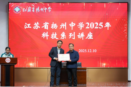 会上,刘东飞受聘为江苏省扬州中学科技副校长。江苏省扬州中学纪委书记王辉林表示,设立“科技副校长”是深化科教融合、提升学生科学素养的重要举措,将为校园带来优质的学术资源和前沿的科学视野。刘东飞表示,助力青少年科学启蒙、引导中学生走近药学、理解药物研发的价值,是高校科研工作者应尽的社会责任。